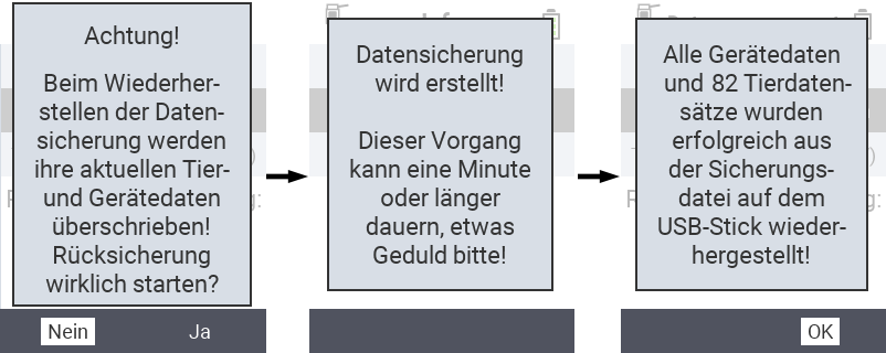 Datenmanagement, wählen Sie dort den EintragDatensicherung einspielenund bestätigen Sie mitOK. Das Gerät fordert Sie jetzt dazu auf, einen USB-Stick einzustecken.