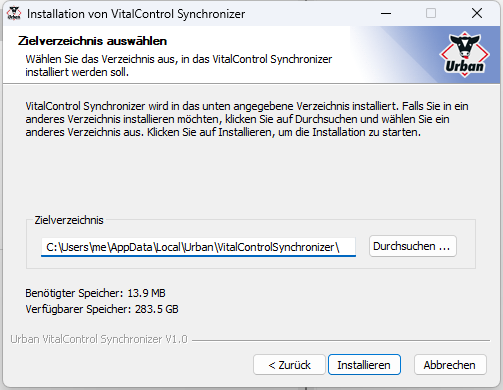 SetupVitalControlSynchronizer.exe.Nur bei Neuinstallation: Es öffnet sich ein Fenster zur Sprachwahl, wählen Sie dort
